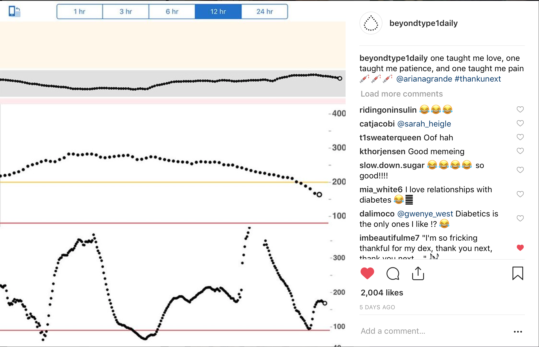 Un meme reciente que hicimos para Beyond Type 1 – ¡Nunca me he reído tanto al ver las reacciones de la gente! Mucha gente se sintió identificada, ¡gracias a Dios! Fue genial ver a las personas ser tan honestas sobre el hecho de que no todos los días van a ser «buenos» días. ¡Esas montañas rusas de azúcar en la sangre son REALES, amigos!